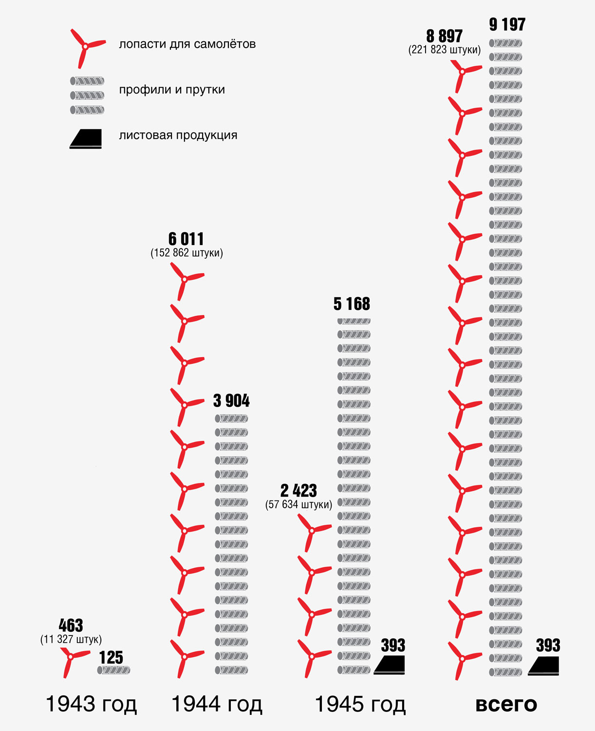 Всего за годы войны КУМЗ выпустил 39913 тонн слитков из алюминиевых сплавов, 221823 лопасти (8897 тонн), 9197 тонн профилей и прутков, 393 тонны листов.